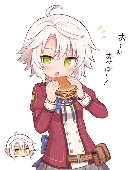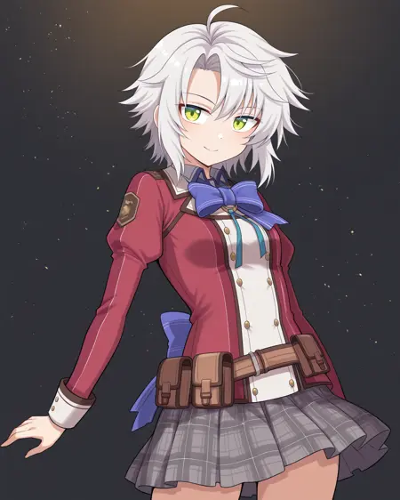 <lora:FieClaussellCS1_Illustrious:1>, Fie Claussell, 흰색 머리카락, 중간 길이 머리, 아호게, 녹색 눈, 작은 가슴, 작은 체형, 학교 유니폼, 빨간 재킷, 리본, 체크무늬 스커트, 벨트 주머니, 검은 양말, 녹색 신발,