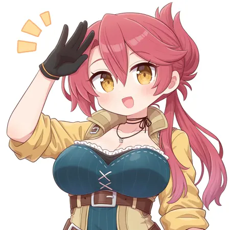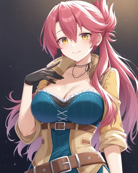<lora:SaraValestein_Illustrious:1>, Sara Valestein, 红发, 黄眼, 大胸, 项链, 蓝色连衣裙, 黄色袖子, 黑色手套, 腰带, 棕色靴子,