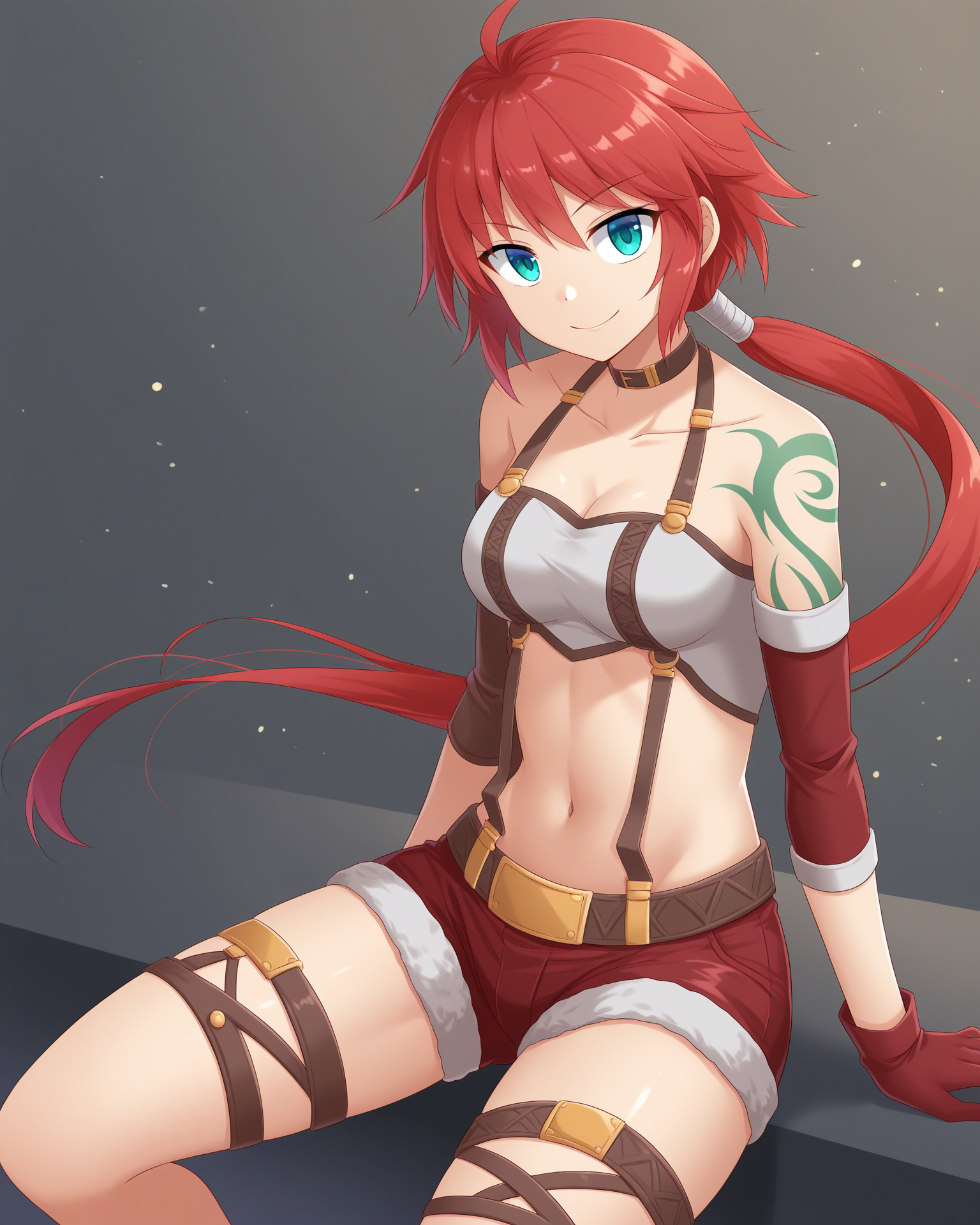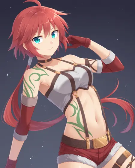 <lora:ShirleyOrlando_Illustrious:1>, Shirley Orlando, 红发, 天线辫, 马尾, 水蓝色眼睛, 中等胸围, 绿色纹身, 紧身胸衣, 项圈, 吊带, 短裤, 腰带, 手套, 大腿绑带, 靴子, 红色鞋履,