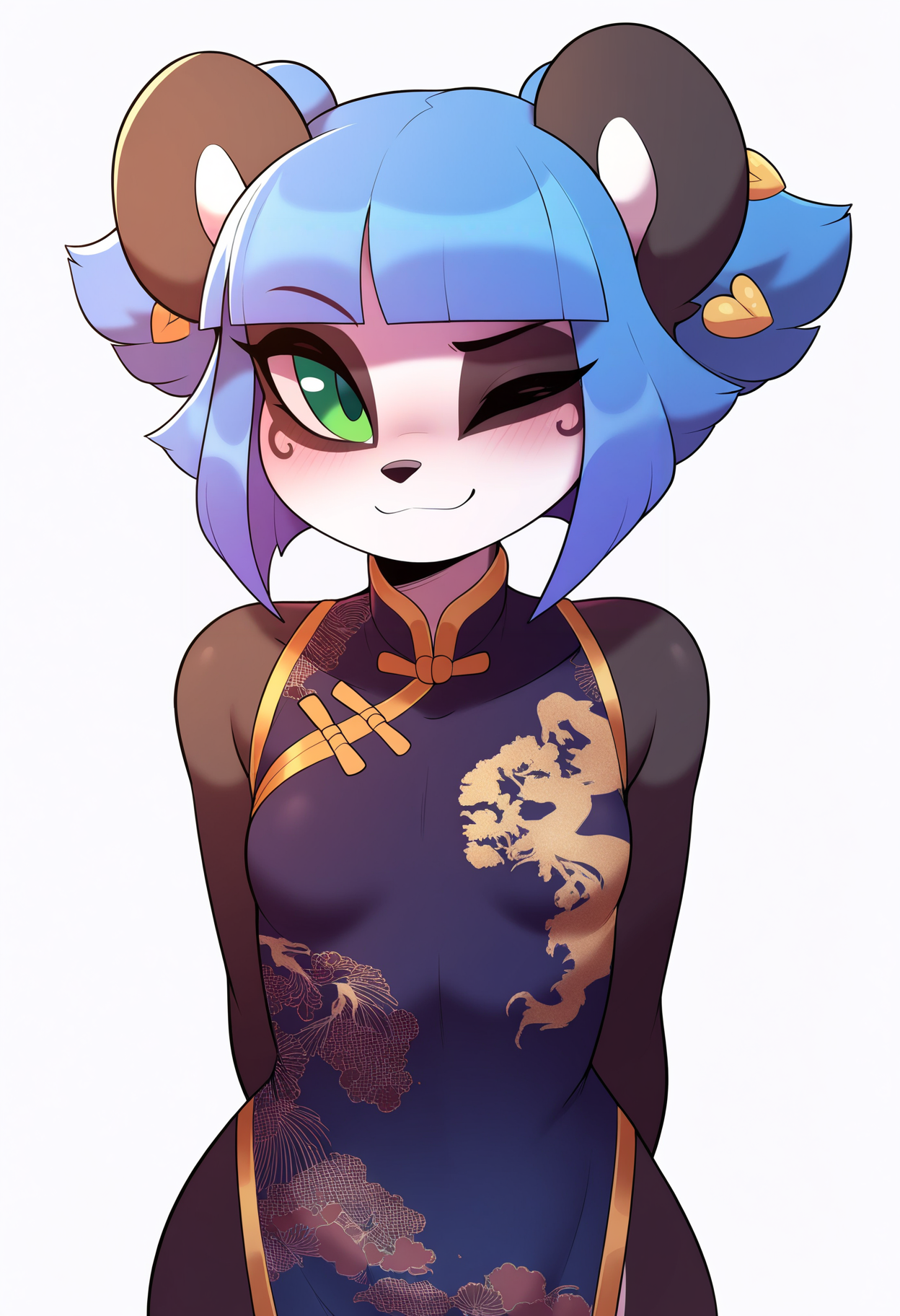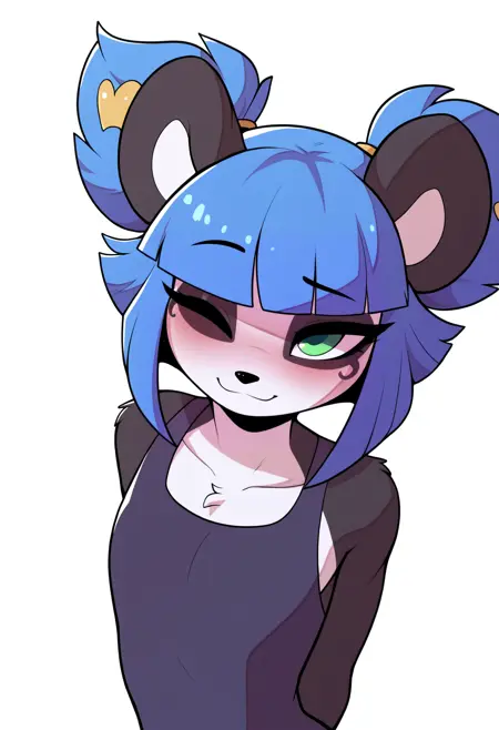 Basic prompts : 1girl, nuwa,blue hair, blunt bangs, short hair, green eyes, hair bow, furry, panda ears, tail