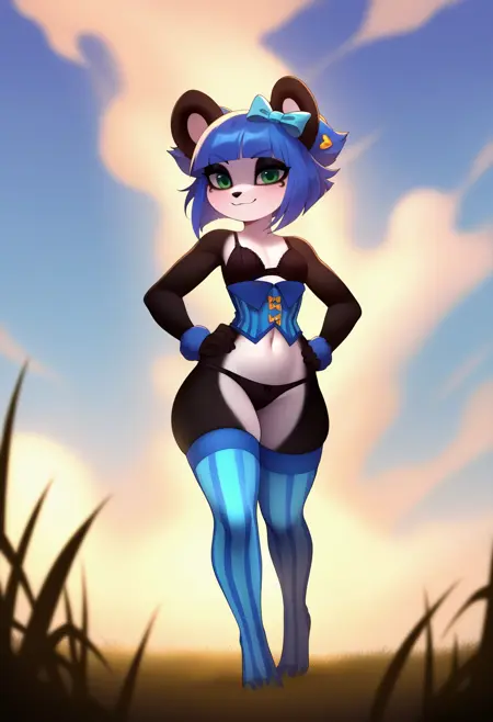 기본 프롬프트: 1girl, nuwa, blue hair, blunt bangs, short hair, green eyes, hair bow, furry, panda ears, tail