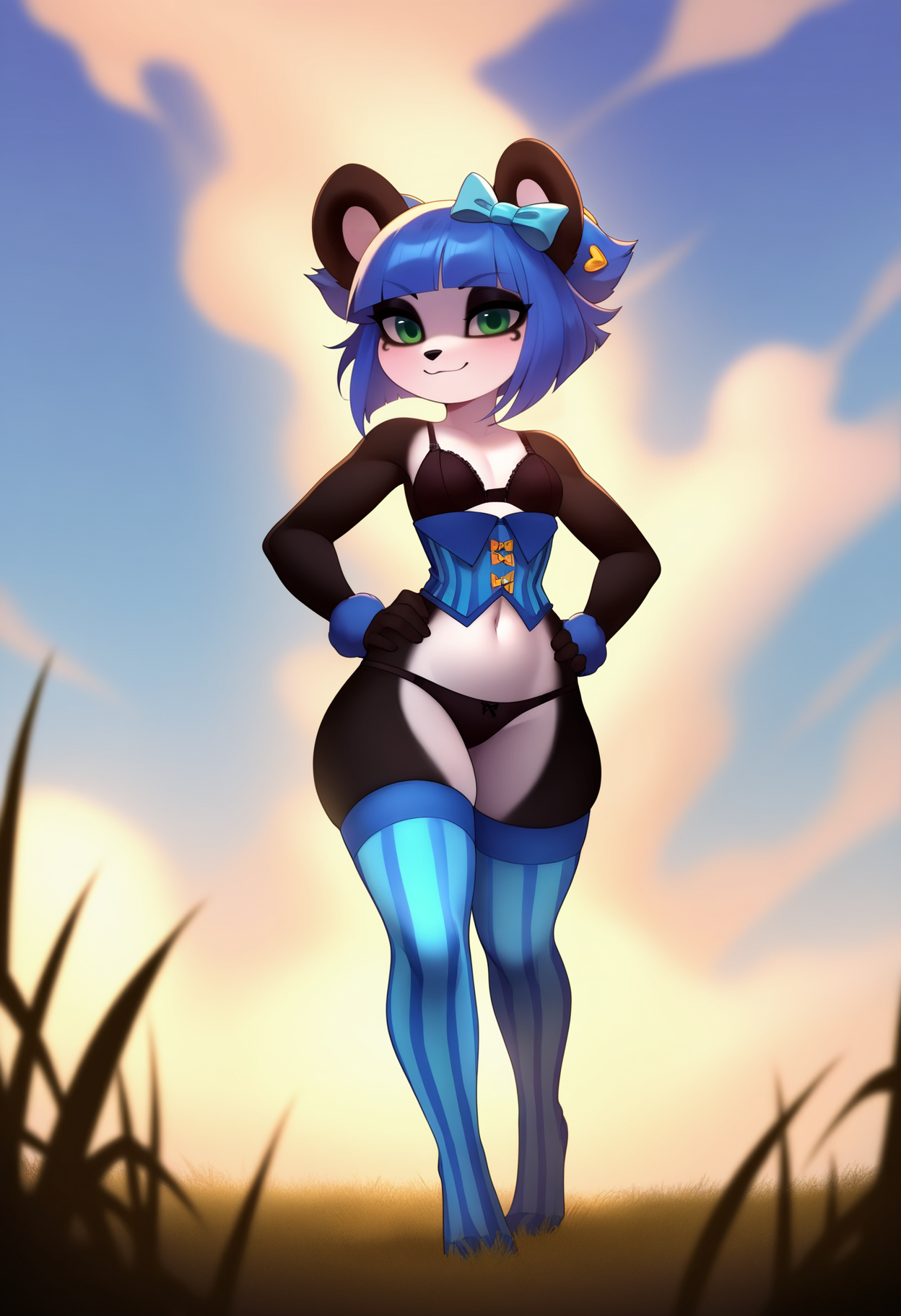 Outfit prompts :  black bra, black panties, blue thighhighs, vertical-striped thighhighs, corset, navel