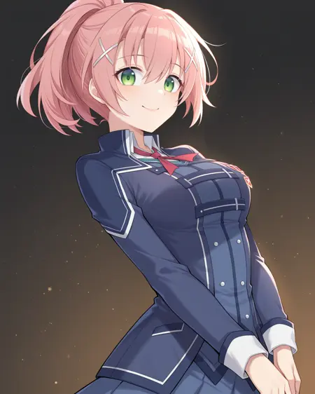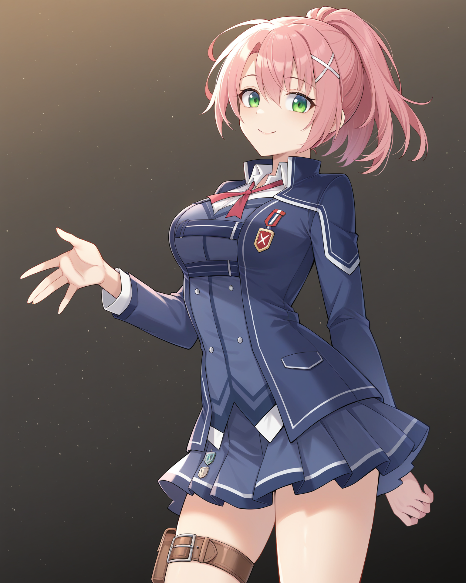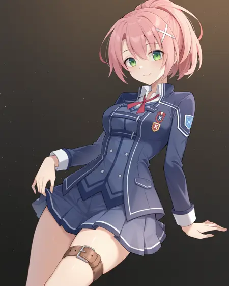 <lora:JunaCrawfordThors_Illustrious:1>, Juna Crawford, pink hair, ponytail, X hair ornament, green eyes, medium breasts, school uniform, blue blazer, blue skirt, red ribbon, knee boots, thigh belt,