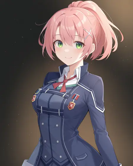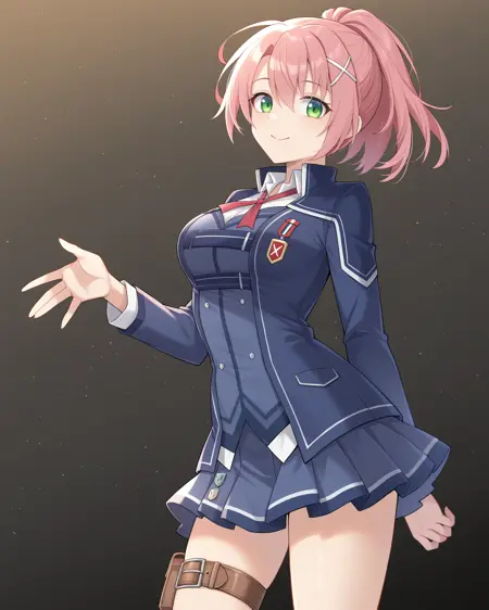 <lora:JunaCrawfordCrossbell_Illustrious:1>, Juna Crawford, pink hair, ponytail, X hair ornament, green eyes, medium breasts, red jacket, yellow shirt, black necktie, white belt, white skirt, brown gloves, boots, black thighhighs,