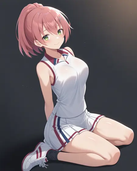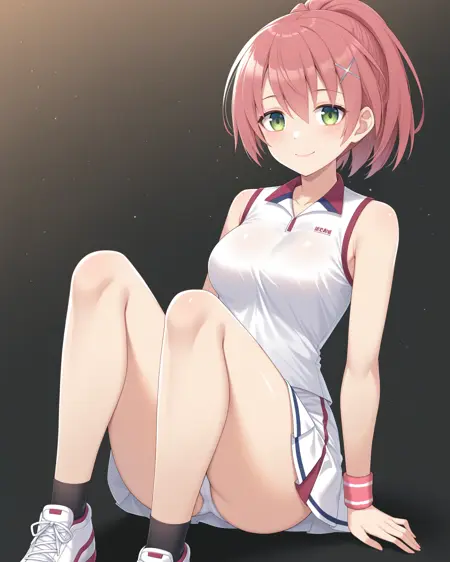 <lora:JunaTennis_Illustrious:1>, Juna Crawford, 분홍색 머리, 단발머리, X 머리 장식, 녹색 눈, 중간 크기 가슴, 테니스 유니폼, 스포츠복, 흰색 스니커즈, 검은 양말,