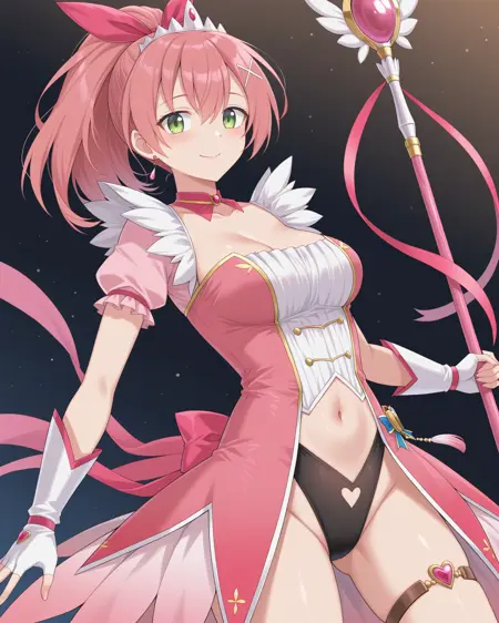 <lora:JunaCrawfordMagical_Illustrious:1>, Juna Crawford, 분홍색 머리, 단발머리, X 머리 장식, 녹색 눈, 중간 크기 가슴, 마법소녀, 티아라, 분홍색 리본, 분홍색 드레스, 배꼽, 팔보호대, 검은 하이레그, 무릎 부츠,