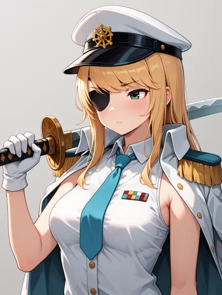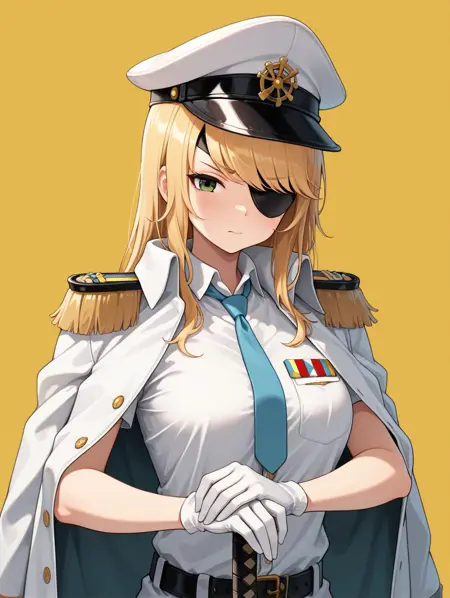 marina, 1girl, solo, 長い髪, 金髪, シャツ, 手袋, 緑の目, ジャケット, 白いシャツ, ネクタイ, ポロシャツ, 白い手袋, 軍服, 白い頭部装備, 目隠し, 白いジャケット, 尖った帽子, 肩章, 軍帽, 青いネクタイ, 肩にかけたジャケット
