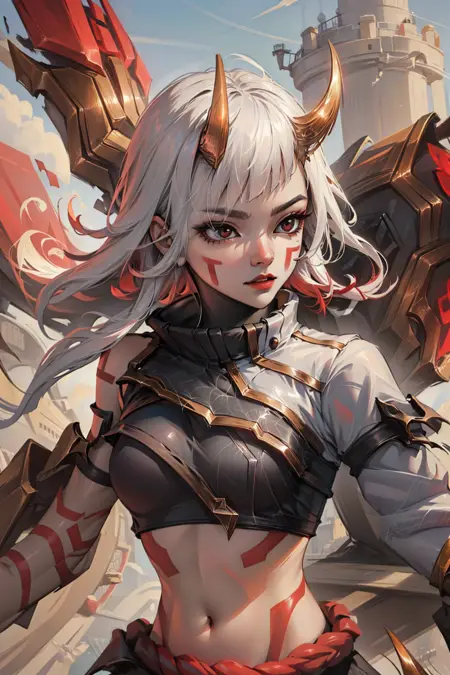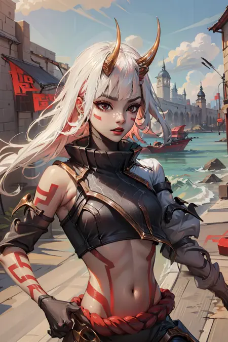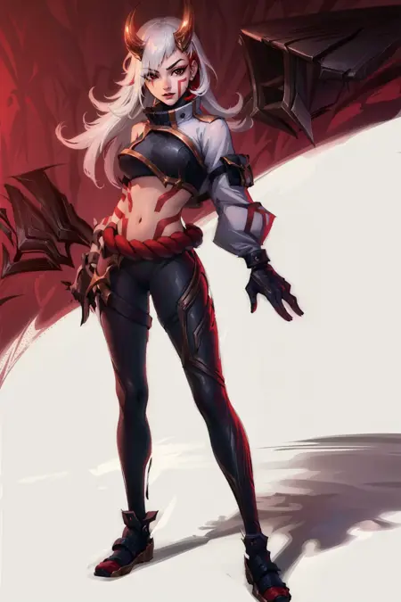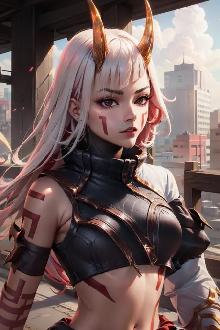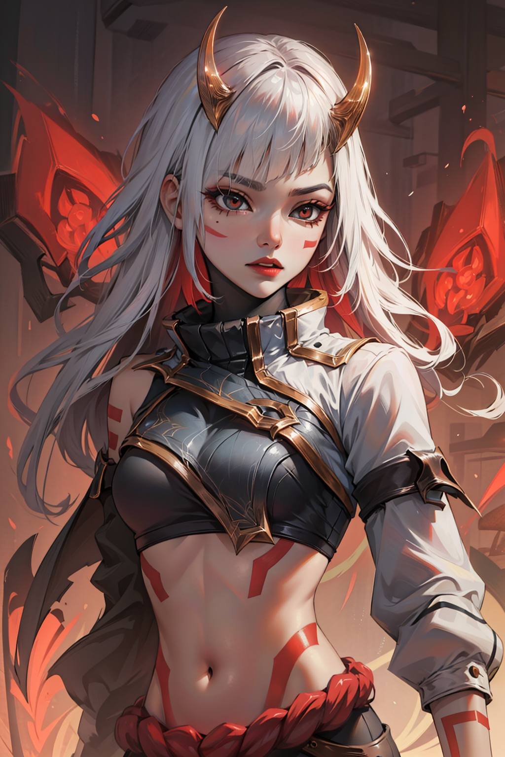 inkshadow kai'sa, 1girl, 长发, 面部纹身, 露脐装, 角, 纹身, 刘海, 多彩发色, 白发, 红发