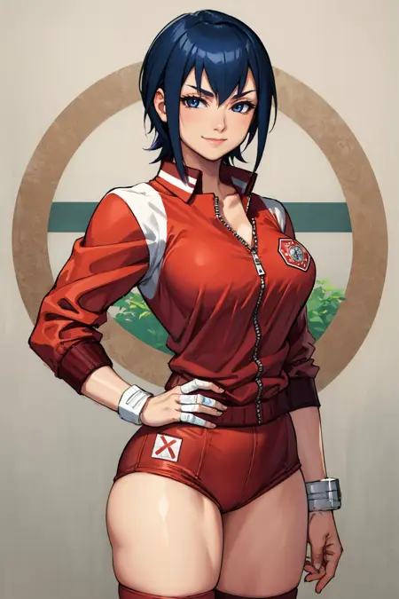 Add "red jacket, short shorts, bandages, knee pads, sneakers" for her typical look.