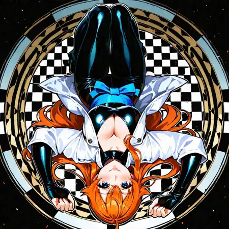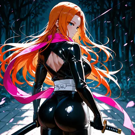 to call use the keyword: Niwa_Masami, orange hair, latex, blue eyes, cleavage, white jacket, samurai,