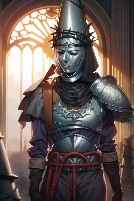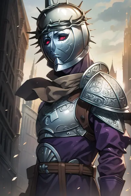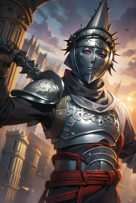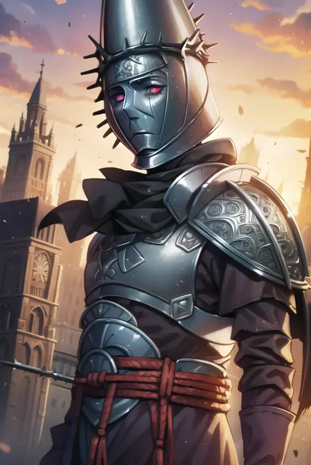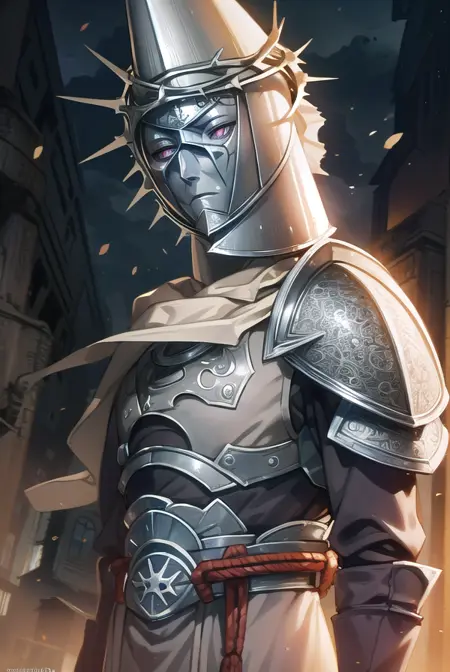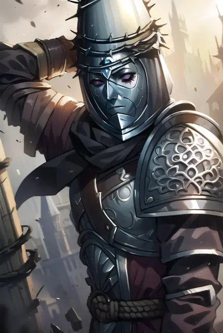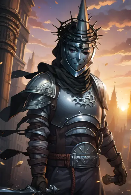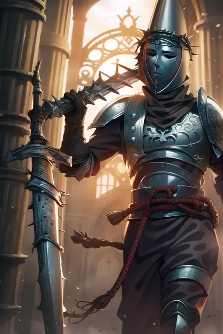 penitent one, gloves, 1boy, holding, weapon, sword, cape, holding weapon, armor, capelet, holding sword, helmet, shoulder armor, brown gloves, pauldrons, breastplate, full armor, (covered face:1.7), (black eyes:1.5),