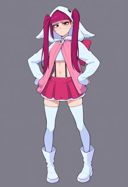 TYBW prompts : hood, hoodie, midriff, zettai ryouiki, white long sleeves, navel, suspender skirt, sleeves past wrists, miniskirt, white thighhighs, white boots