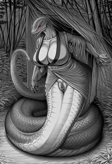 alien, alien girl, phase 4 alien, standing, from frontal, 1girl, lips, alien eyes, black eyes, double deck, thick body, black and white, out of frame, large areola, large breasts