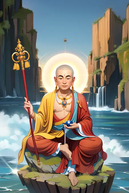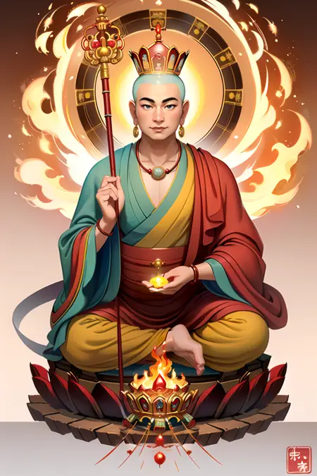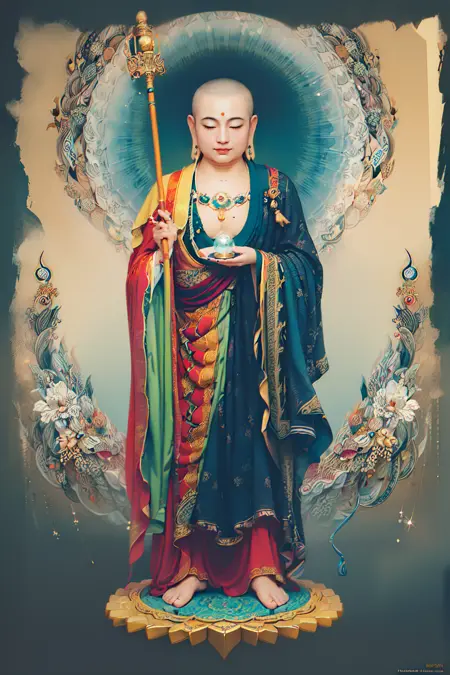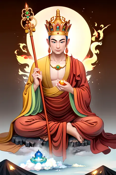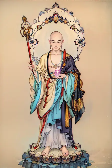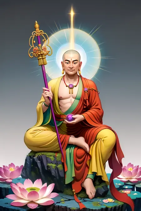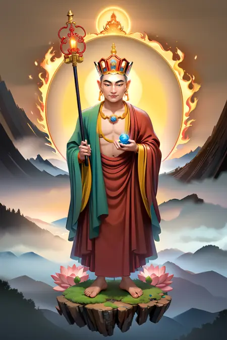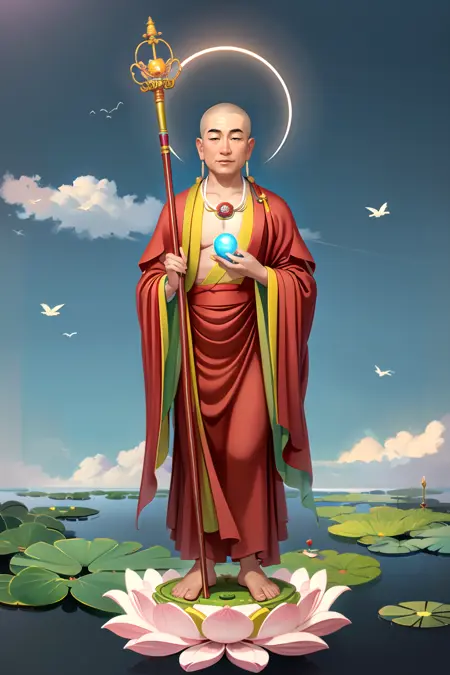 Ksitigarbha Bodhisattva, a buddha wearing robe with a staff and a glowing beads in his hand and standing on a lotus flower