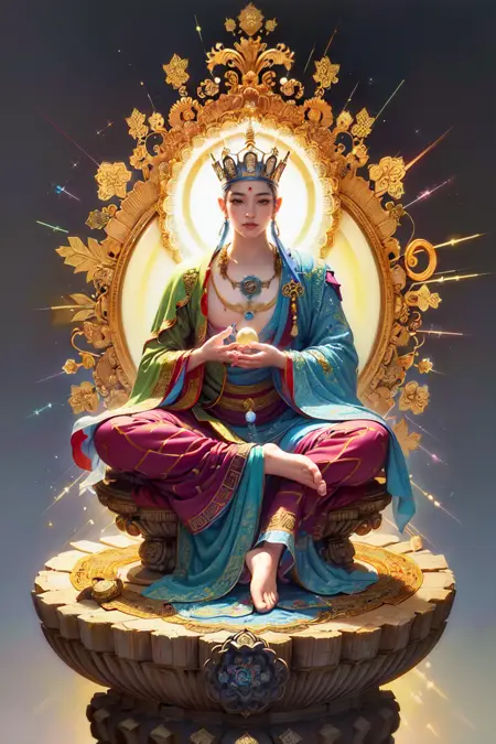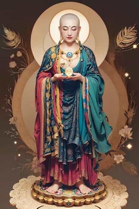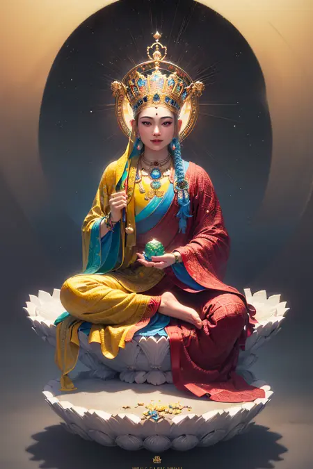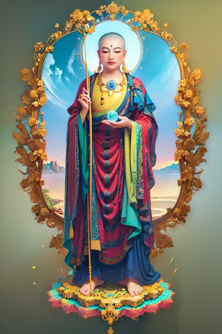 Ksitigarbha Bodhisattva,digital painting,robe,lotus flower,holding staff,glowing beads in his hand, halo around his neck,crown on top of it