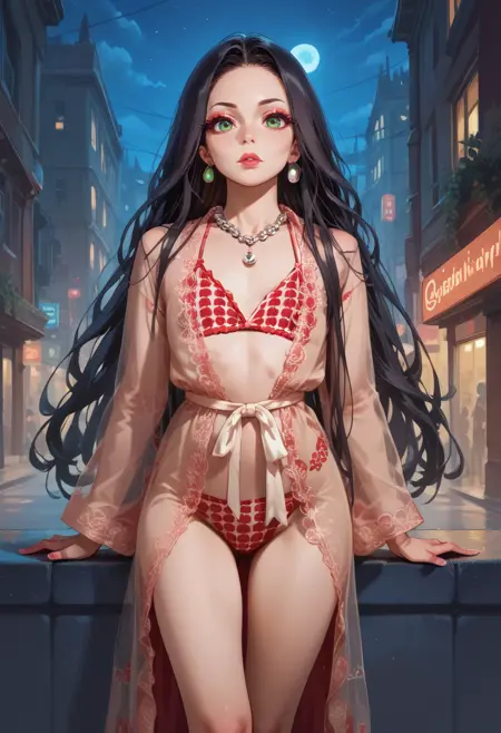 She is a perfect slender woman with a beautiful flat chest. Her charm points are her long black hair and green eyes with an intimidating look.