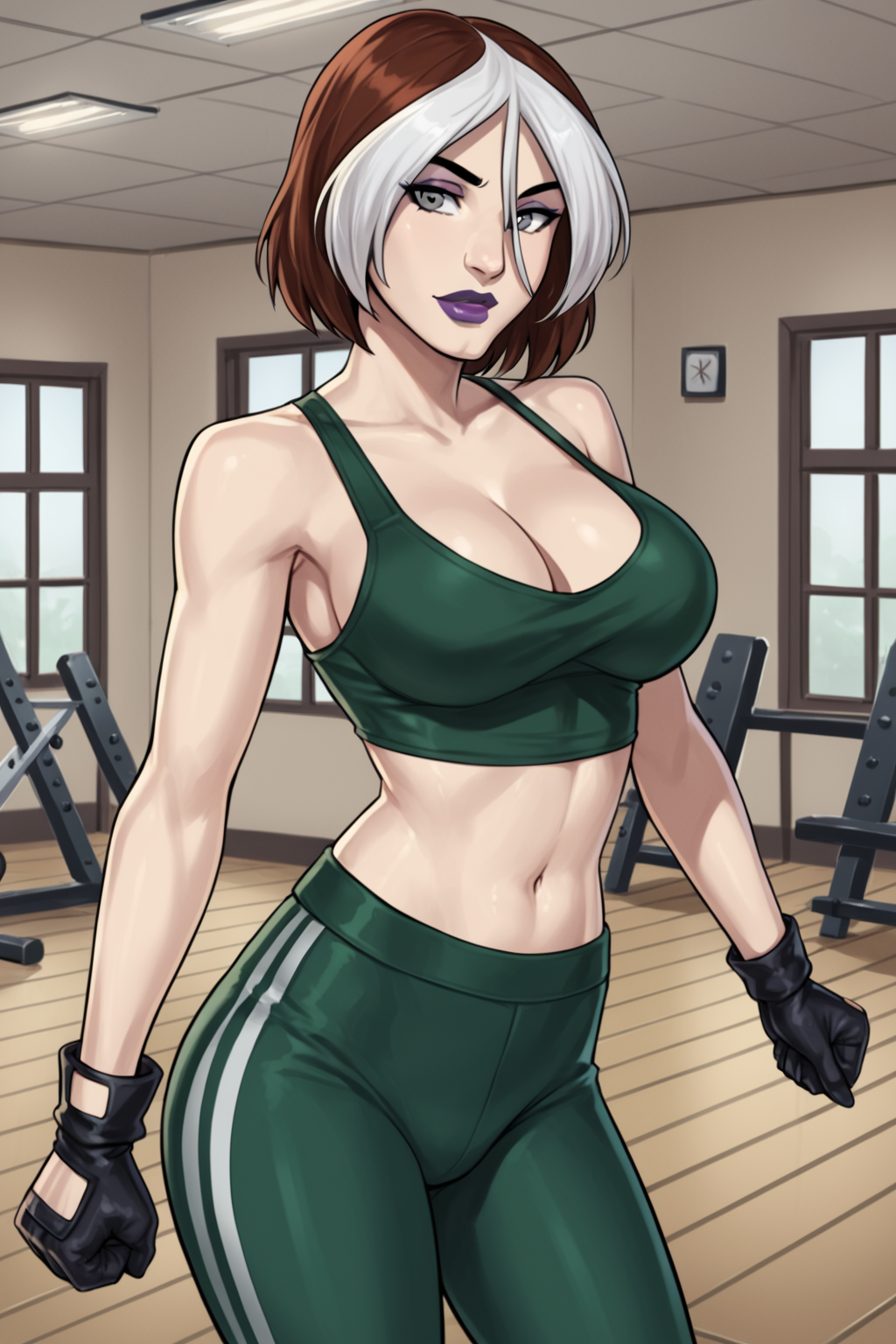 Alternate Workout: cleavage, tank top, black gloves, green leggings, boots