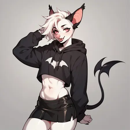 Bitsy the bat_(Character), Femboy, white body, white hair, black tail, anthro bat, Solo, black hoodie, black skirt,