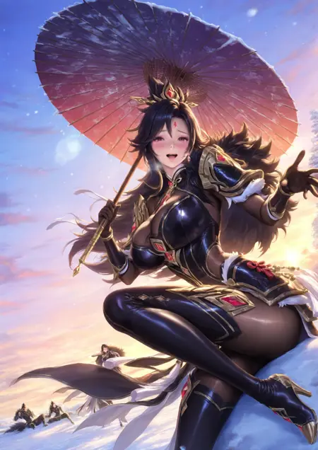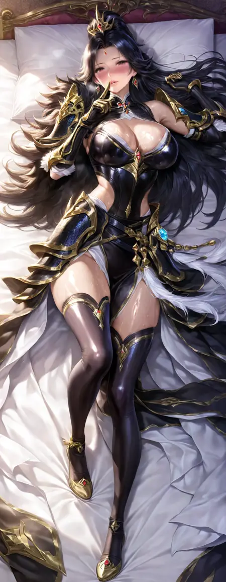 Tags:lora:三国杀吕玲绮:1,1girl,armor,black hair,breasts,cape,long hair,looking at viewer,solo,thighhighs,incredibly absurdres,wallpaper,curvy,
