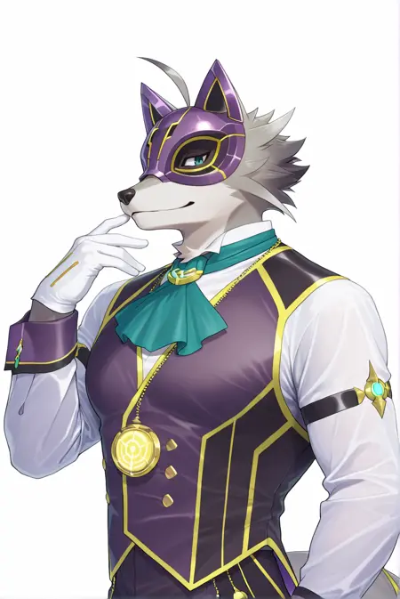 Butler, mask, shirt, purple vest, white gloves, black pants, bow tie,