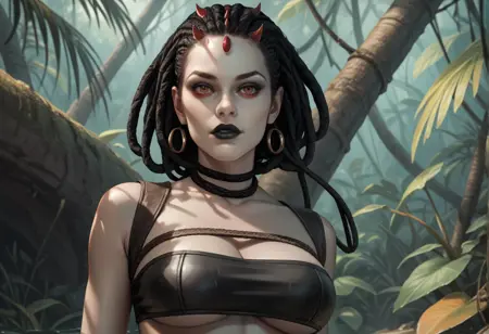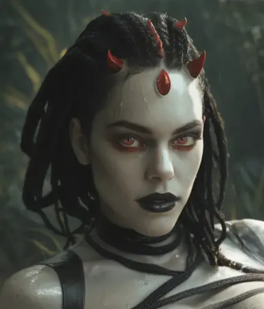 MarisBrood, Grey Skin, black lips, red eyes, black lipstick, black hair, dreadlocks, horns, red horns, Zabrak, black crop top, leather pants, boots, midriff,