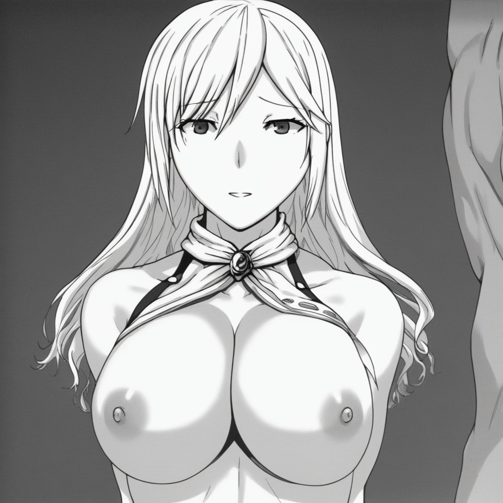 alisa ilinichina amiella, cleavage, bangs, thin waist, wide hips, beautiful skin, beautiful ember blue eyes, beautiful hair, beautiful long bright grey silver hair, bangs,
