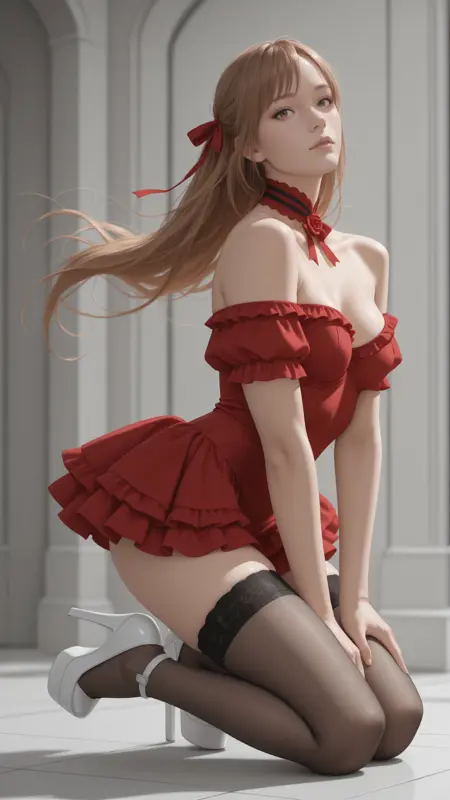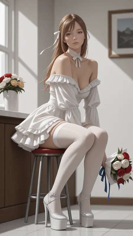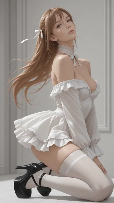 nbl, white dress, long ruffled sleeves, off the shoulder, ribbon_ruffle_choker, thigh highs, platform shoes,