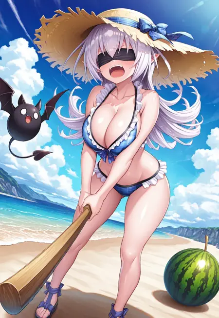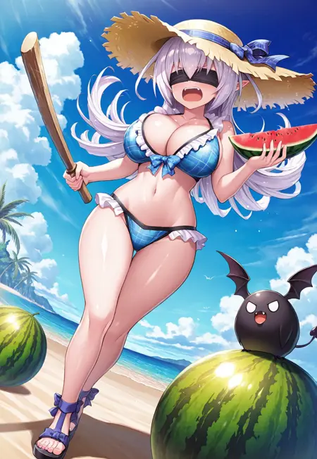 3つ目の衣装:麦わら帽子、フリル付き青いチェックのビキニ