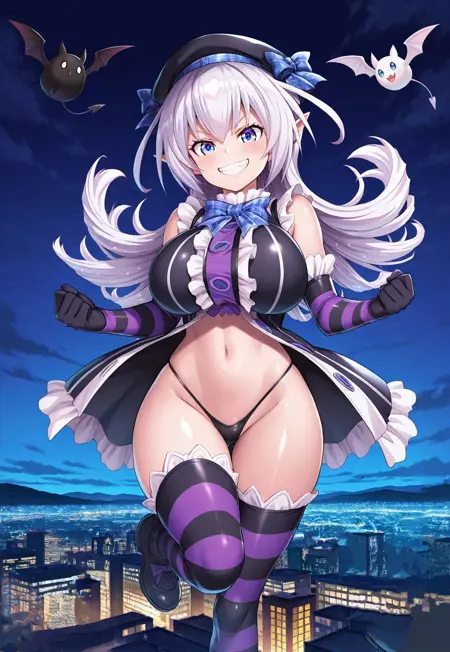 1번 복장: 검은 베레모, 소매 없는, 줄무늬 옷, 검은 프릴이 있는 드레스 상의, 파란 체크 무늬 리본, 배꼽, 검은 톤, 검정과 보라색 줄무늬 팔꿈치 장갑, 검정과 보라색 줄무늬 허벅지 스타킹, 검은 신발