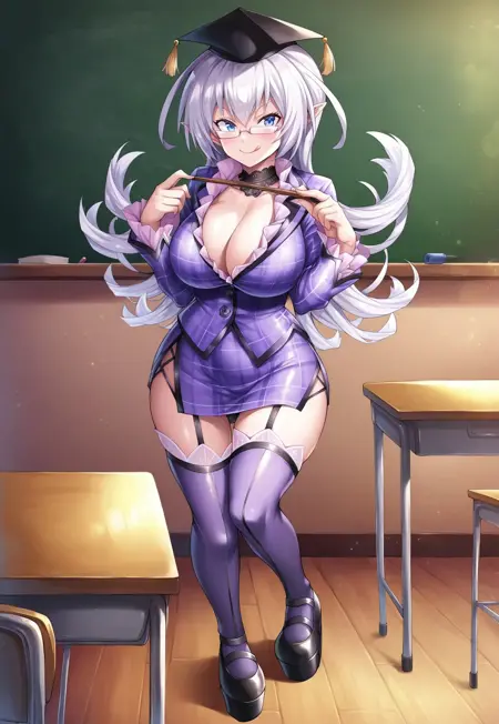 2nd outfit: small graduation cap, glasses, purple plaid dress with pink frills, black frill choker, long sleeves, cleavage, purple thighhighs, black platform shoes, holding long pointer