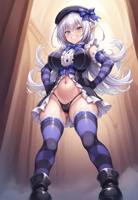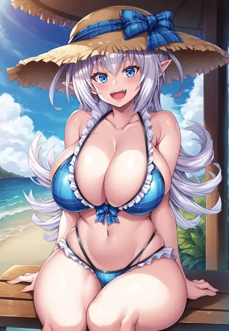 Tags: Miriam, long hair, white hair, blue eyes, pointed ears, large breasts, shiny skin, curvy, wide hips