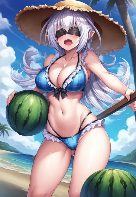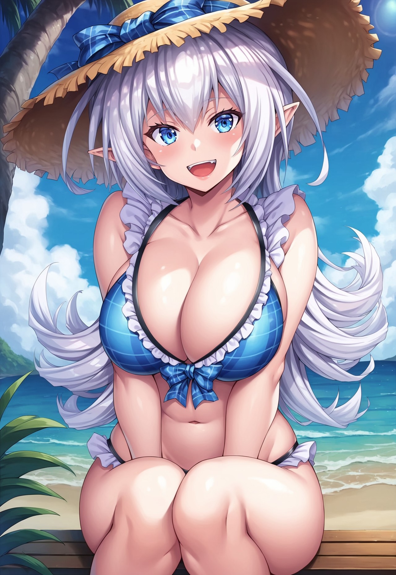3rd outfit: straw hat, frilly blue plaid bikini