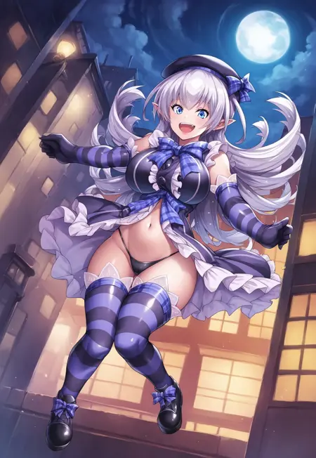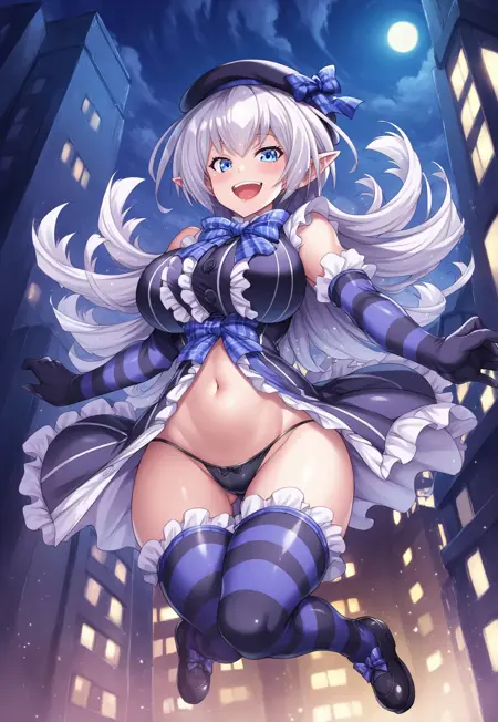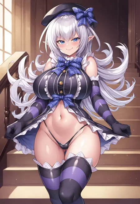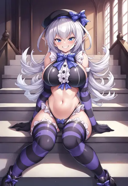 1st outfit: black beret, sleeveless, striped clothes, black frilly dress top, blue plaid bow, navel, black thong, black and purple striped elbow gloves, black and purple striped thighhighs, black shoes