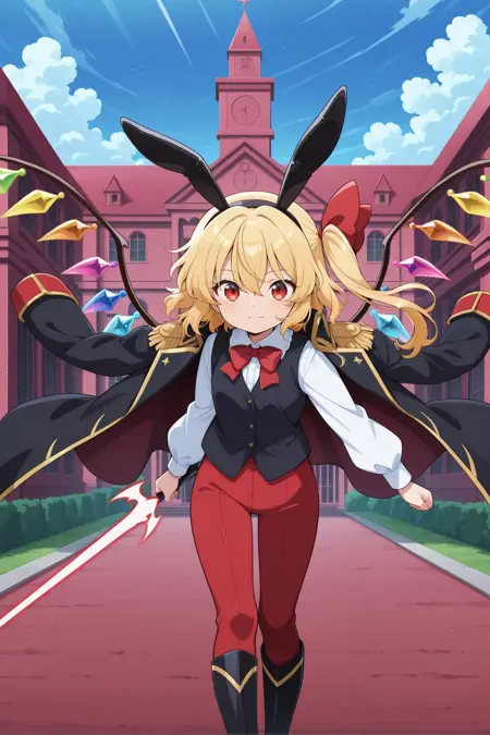 flandre scarlet, 1girl, solo, red eyes, blonde hair, one side up, hair between eyes, wings, alternate costume, side ponytail, fringe trim, fake rabbit ears, black ears, black coat, coat on shoulders, epaulettes, red bowtie, sweater vest, black vest, white shirt, long sleeves, puffy sleeves, red pants, knee boots, holding energy sword,