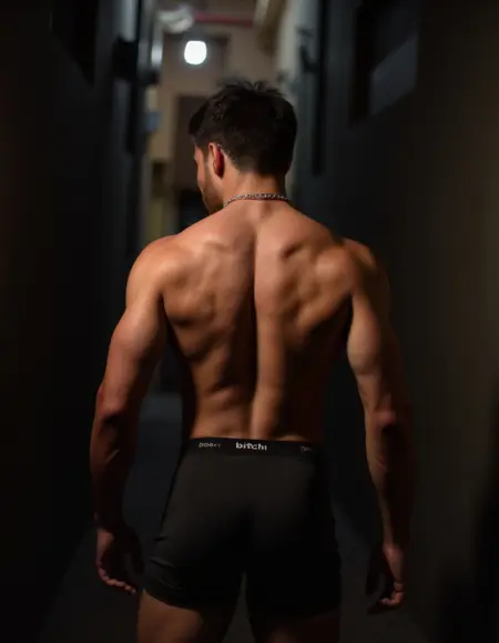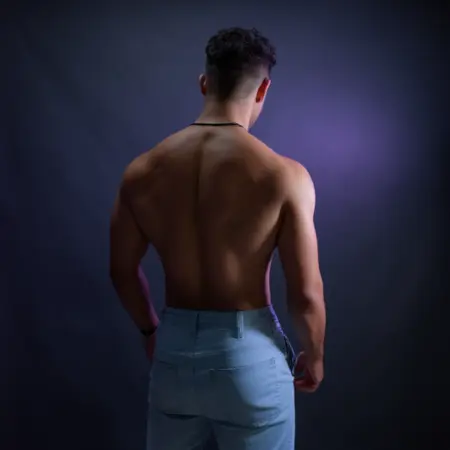 リラックスした筋肉質な背中で男性がポーズをとる画像を作成する。