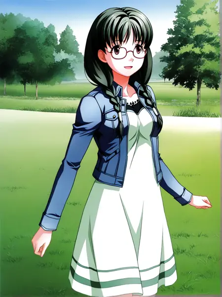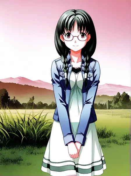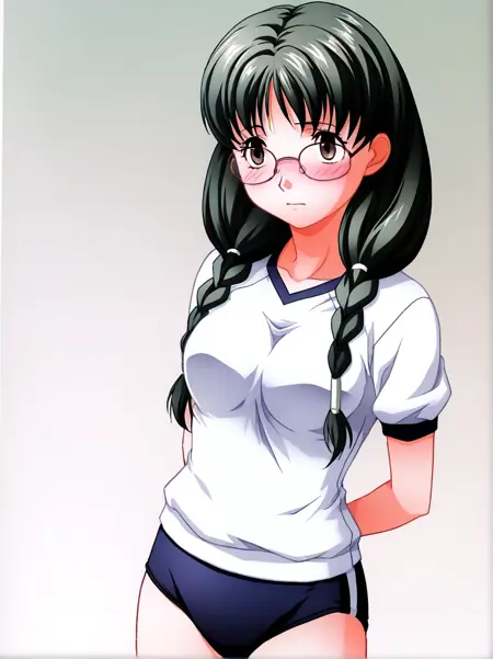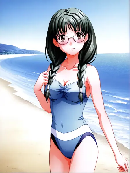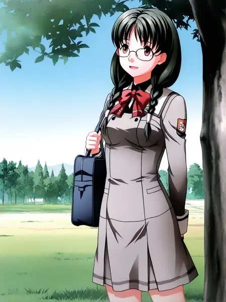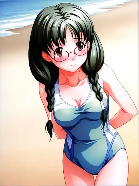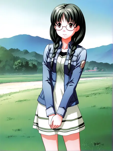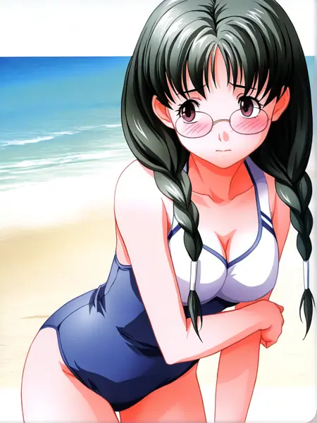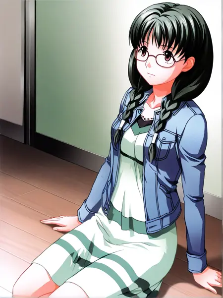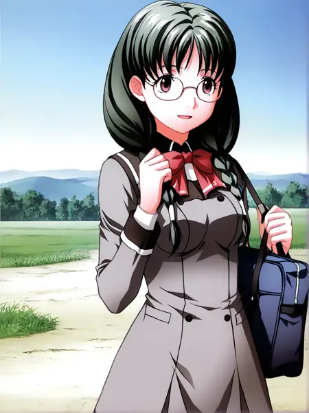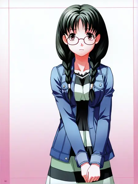 kuri_shouko, 1girl,solo, long hair, glasses, twin braids, dark green hair, brown eyes, hair over shoulder,
