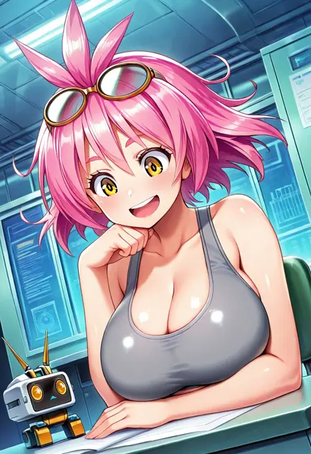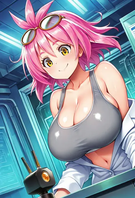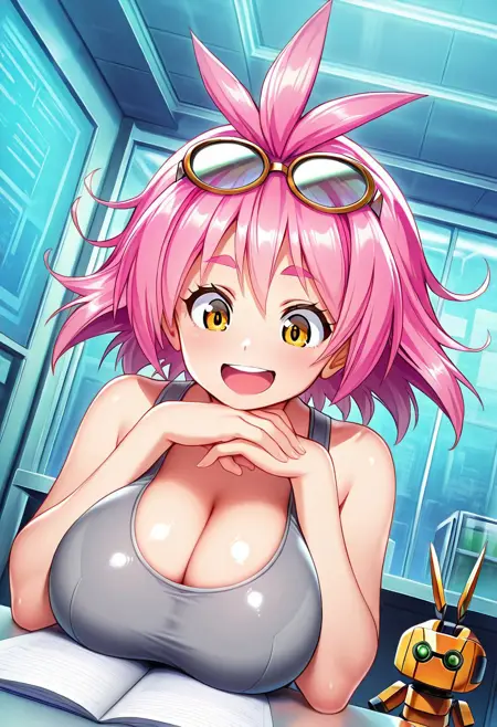 태그: 르네, 단발, 분홍색 머리, 머리에 안경, 노랑색 눈, 큰 가슴, 넓은 골반, 빛나는 피부, 곡선미,