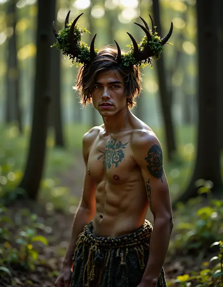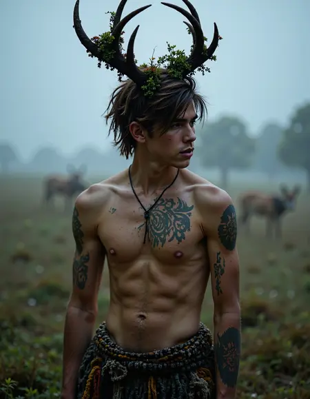 提示关键词:"赤裸上身并有纹身" "戴着覆盖苔藓的鹿角头饰" "穿着羊毛短裙"