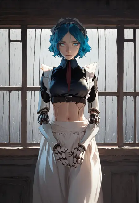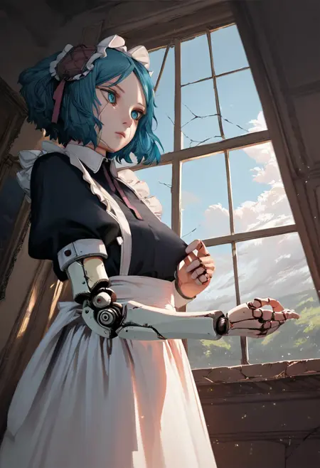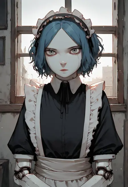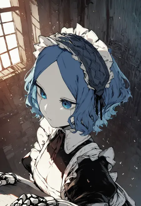 ciber_maid_c30, 1girl, maid,maid headdress, short hair, joints,(doll torso:1.3),cracked skin, blue hair, blue eyes,puffy sleeves, enmaided,