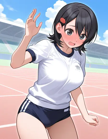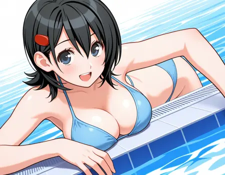 Iroha(Koi_no_Iroha), 1girl,solo,iroha (samurai spirits), black hair, short hair, large breasts, red hair clip, black eyes, flipped hair,