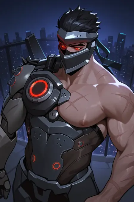 ブラックウォッチジェンジー - blckwtch, 片方の機械の腕, マスク, 人間の目が見える, 眉毛, 瞳, 黒髪, 筋肉質, 赤い目, 乳首, 体の血管, 光る目, 口元のマスク, 額がカバーされている