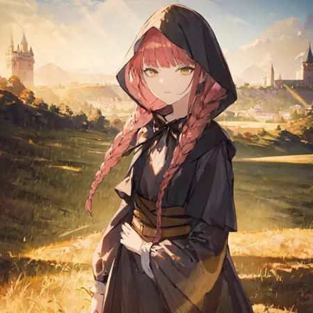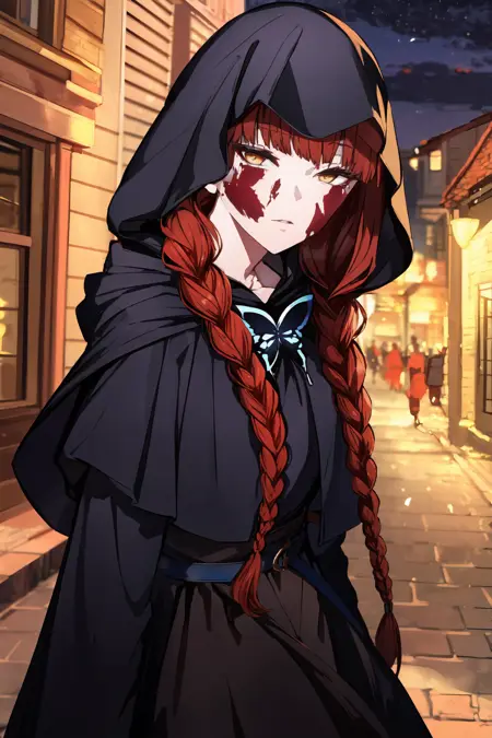 触发词:摩根娜,主裙,烧伤的脸,蝴蝶斗篷扣,兜帽拉起,骨骼手臂*