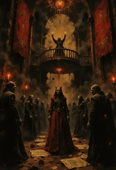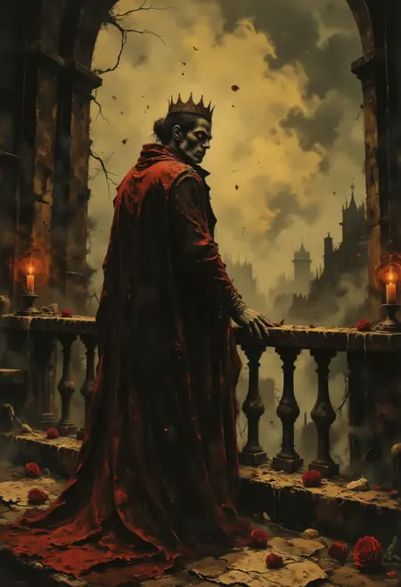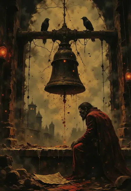 Intricate Detail: From cracked walls and weathered staircases to flowing blood-red fabrics and glowing supernatural elements, the LoRA renders fine details with a painterly precision.