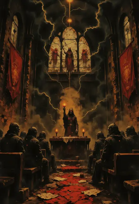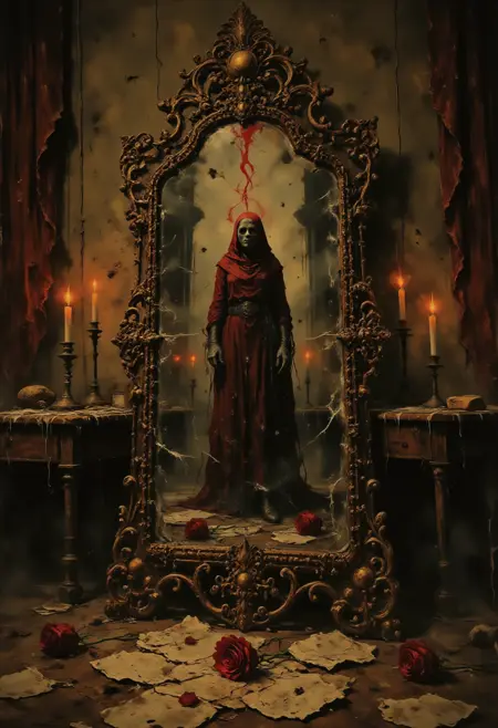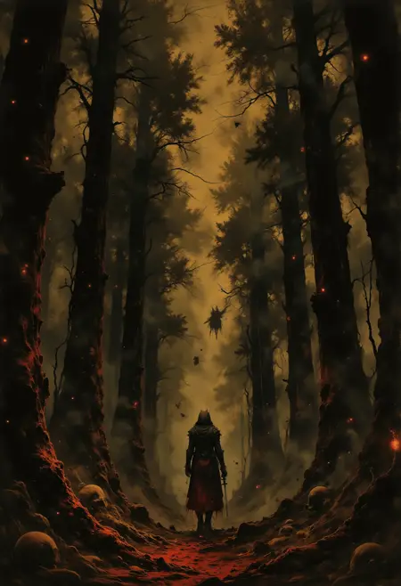 此LoRA的标志性在于其创造“氛围构图”的能力——无论是破败的城堡、闹鬼的走廊、被诅咒的森林,还是身披猩红与漆黑的 menacing 角色。其美学通过发光元素(如燃烧的剑刃、幽灵般的眼眸或魔法物品)进一步升华,这些元素与黑暗腐朽的背景形成绝妙对比。明暗的交织营造出既迷人又令人战栗的视觉张力。