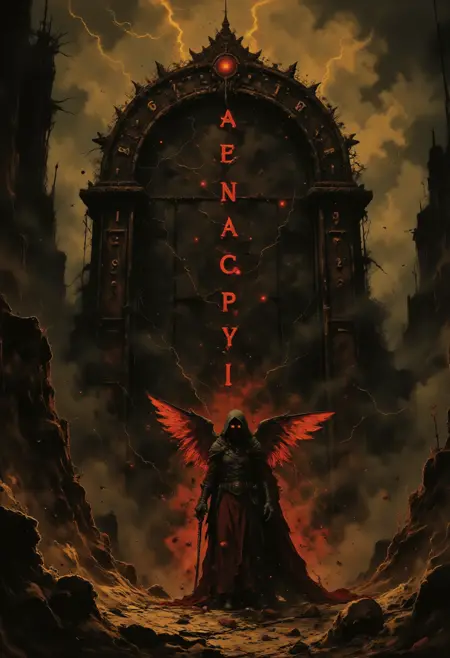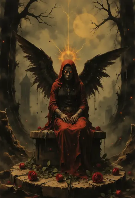 "A fallen angel in a tattered crimson robe, kneeling on a cracked stone pedestal surrounded by blood-red roses, glowing eyes, and ominous wings."