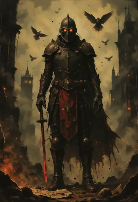 “一位身披风化铠甲的邪恶骑士,手持发光利剑,伫立于烈焰战场,周围萦绕着诡异的阴影与幽灵身影。”