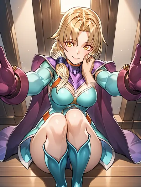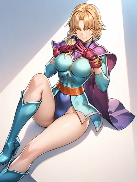 提示示例:iria,金色头发,紫色斗篷,黄色眼睛,紧身衣,手套,微笑,盔甲,及膝靴,大腿间隙,蓝色紧身衣,长袖,迷你裙,低马尾,