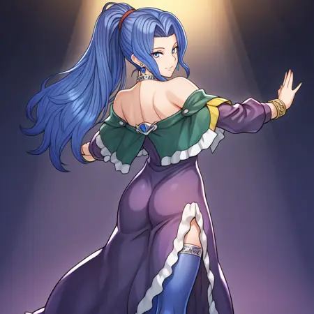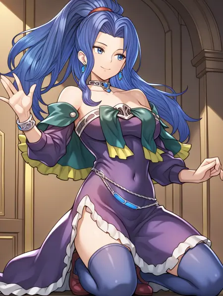 prompt example :maveru,thighhighs,blue eyes,long hair,bare shoulders,collarbone,ponytail,blue hair,jewelry,purple dress,bracelet,long sleeves,choker,earrings,strapless,capelet,