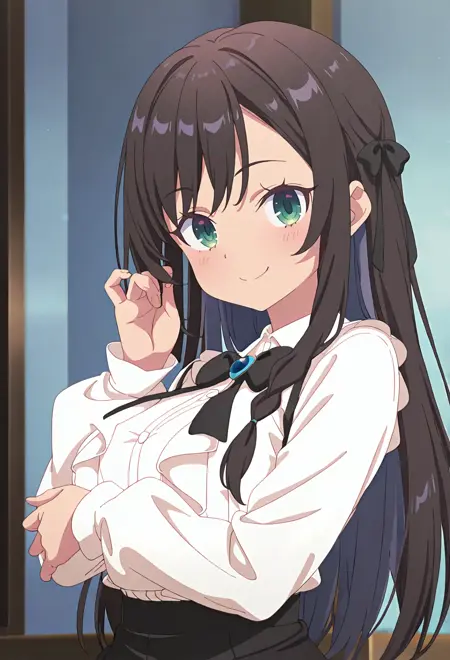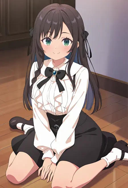 alnclv-default,green eyes,black hair,long hair,hair ribbon,braid,frilled shirt,white shirt,long sleeves, black bow,high-waist skirt,black skirt,white socks,mary janes