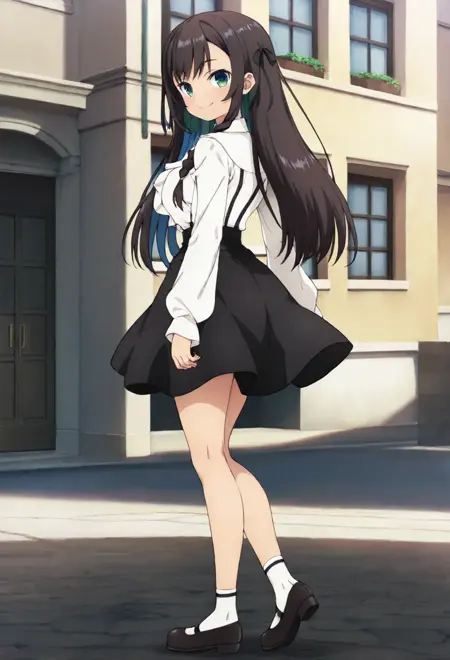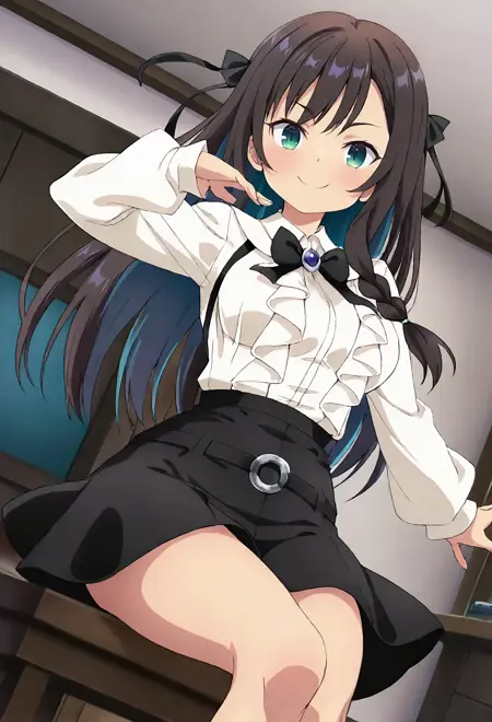 alnclv-default,green eyes,black hair,long hair,hair ribbon,braid,frilled shirt,white shirt,long sleeves, black bow,high-waist skirt,black skirt,white socks,mary janes